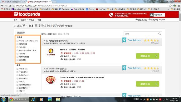 頁面會出現該路段可提供訂餐外送服務的餐廳數,在左側欄位上方還可篩選「只顯示」的項目,包括線上付費、現有的優惠、可供外帶、foodpanda外送之餐廳、可供預訂、營業中、英文菜單等,當然沒勾選出現的餐廳也愈多。