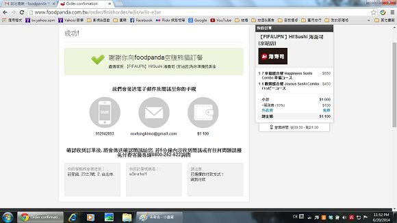 訂餐成功後系統會發送簡訊及電子郵件,確認金額及訂購內容。
